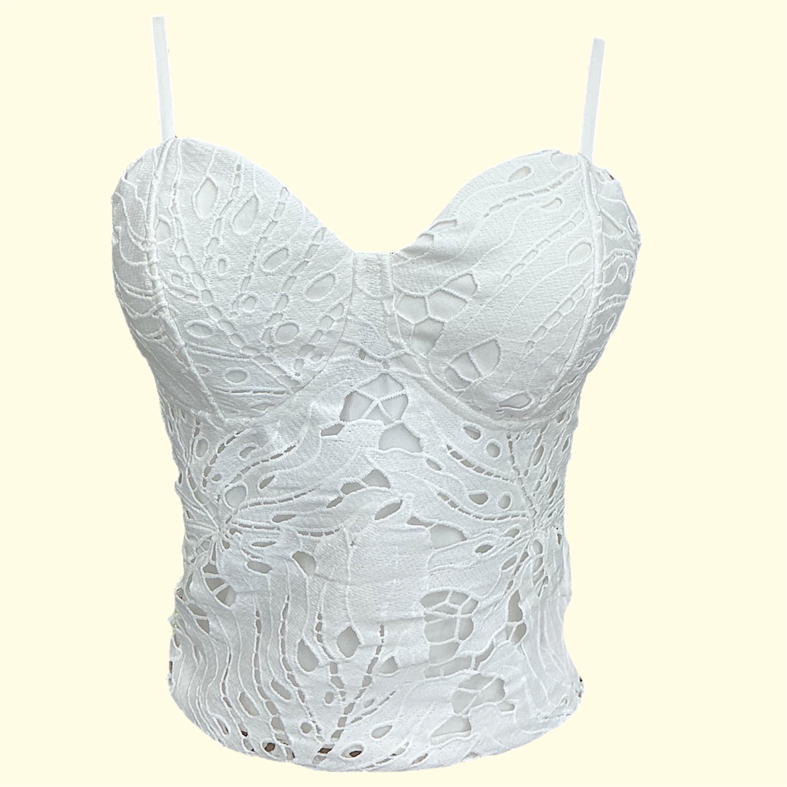 Un diseño elegante y sofisticado que resalta la feminidad en cada detalle. Este corset confeccionado en encaje floral blanco incluye un forro interior para mantener la cobertura y realzar la silueta con sutileza. Su estructura estilo corset y delicados acabados en el borde inferior aportan un toque romántico y moderno a la vez. Perfecto para combinar con pantalones de talle alto o faldas, creando looks versátiles que van del día a la noche con facilidad.