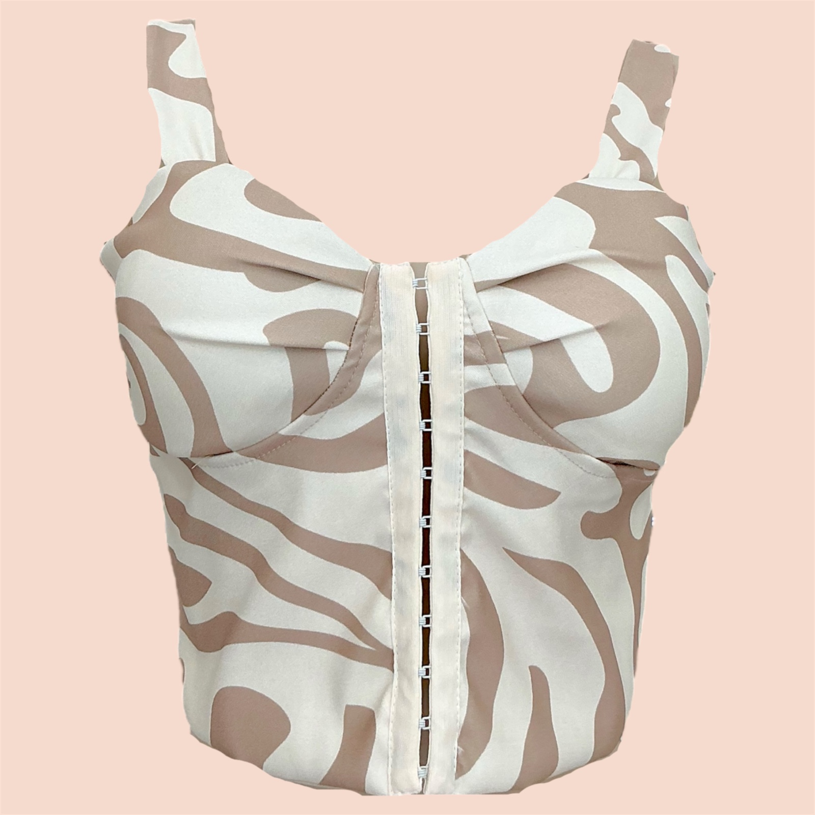 Este corset combina el aire moderno con un estampado abstracto en tonos beige y blanco que aporta frescura y estilo. Su diseño con broches frontales resalta la silueta, mientras que el escote estructurado aporta un toque sofisticado. Ideal para looks de día con jeans o para elevar un outfit de noche con pantalón de tiro alto.
